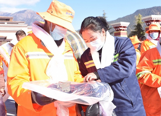 1月7日,為表達(dá)對國策一線環(huán)衛(wèi)工人的關(guān)懷和祝福,林芝市慈善總會在工布公園工布廣場開展了“寒冬送溫暖 致敬城市美容師”送冬衣活動?;顒蝇F(xiàn)場,市慈善總會工作人員為50名環(huán)衛(wèi)工人敬獻(xiàn)哈達(dá),并送上慰問冬衣。